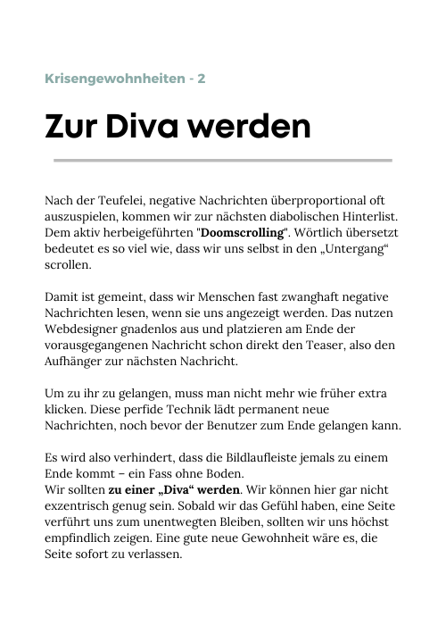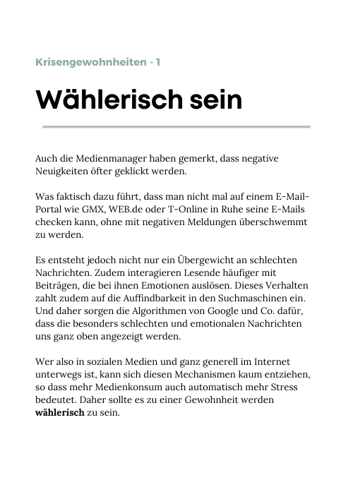 Die verstärkte Wahrnehmung von negativen Informationen, selbst wenn positive oder neutrale Botschaften bei den Experimenten überwogen, haben gezeigt, dass wir Menschen uns auf negative Nachrichten fokussieren. Mit diesem Wissen um diesen „Negativity Bias“ unseres Gehirns, wäre es für sich genommen schon ratsam, die Nachrichten, die ja überwiegend aus negativen Informationen bestehen, zu reduzieren.