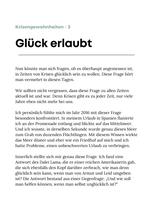 Was uns in diesen Zeiten wirklich helfen kann, sind Routinen und Gewohnheiten. Daher haben die 10+1 Glücksgewohnheiten, die ich bereits 2016 in meinem ersten Buch, „Die Glücksgewohnheiten“ (erhältlich bei amazon) niederschrieb, mehr Relevanz denn je. Denn wenn wir es in Krisenzeiten hinbekommen, so etwas wie Normalität und Gewohnheiten aufrechtzuerhalten, dann schaffen wir damit Räume in unserem Alltag, in denen wir uns sicher fühlen. Daher eignen sich Krisen definitiv auch dafür, einmal generell Inventur zu machen und zu überprüfen, welche neuen guten Gewohnheiten zum Wohlbefinden noch zusätzlich beitragen könnten.