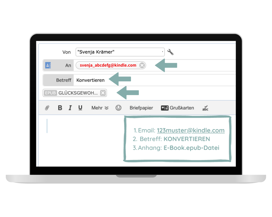 ⇒ Nun eine E-Mail an die Kindle-E-Mail-Adresse senden. Und zwar aus dem E-Mail-Postfach, mit dem du bei amazon/Kindle registriert bist. Als Betreff soll Konvertieren eingetragen werden. Als Anhang bitte das hier runtergeladene Ebook anhängen.